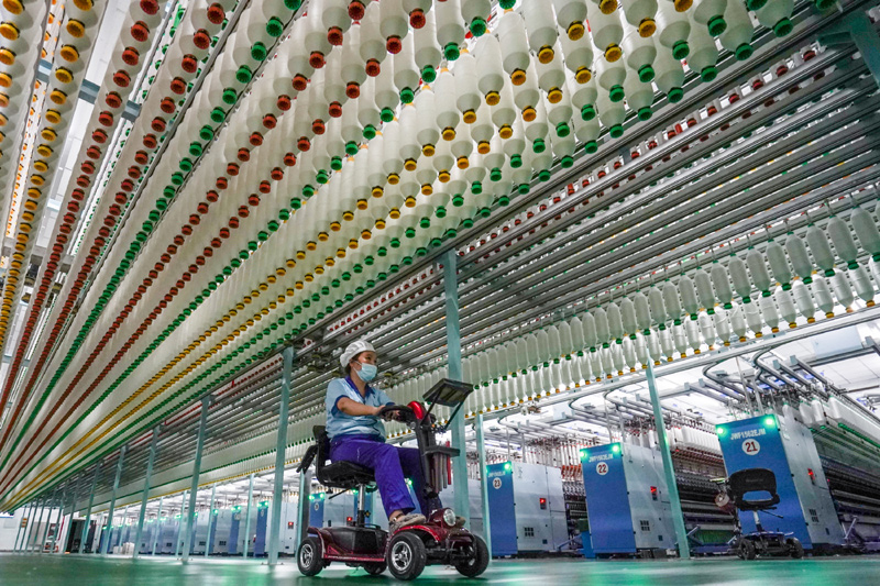 紡織工人在江蘇大生集團有限公司數字化紡紗車間内作業(10月26日攝)。新華社記者 李博 攝