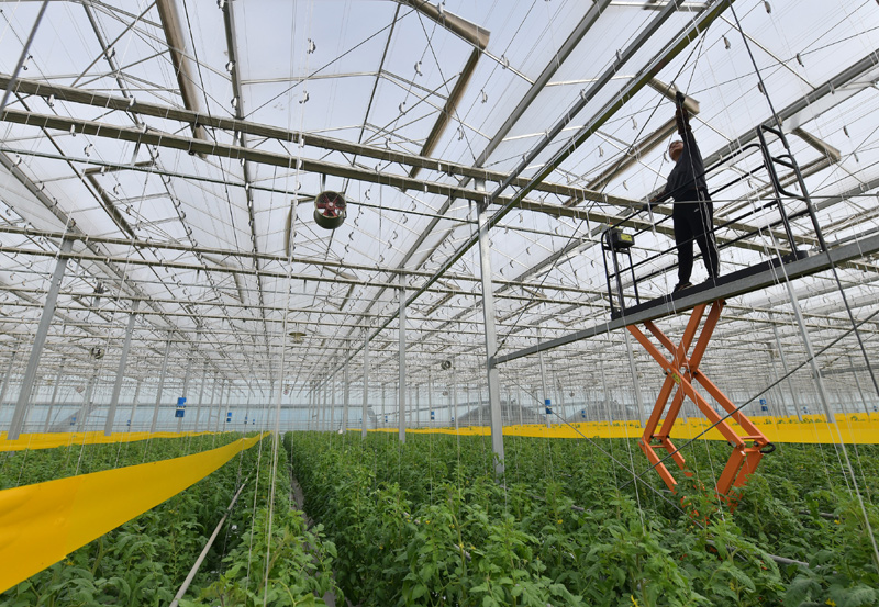 在山東省聊城市耿店村的現代化玻璃溫室内,一名村民使用升降設備進行田間養護(2020年10月20日攝)。新華社記者 李賀 攝