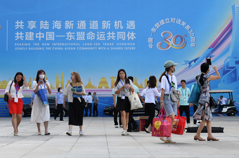 9月11日,在廣西南甯國際會展中心,參觀者走出第18屆中國—東盟博覽會展館。新華社記者 陸波岸 攝