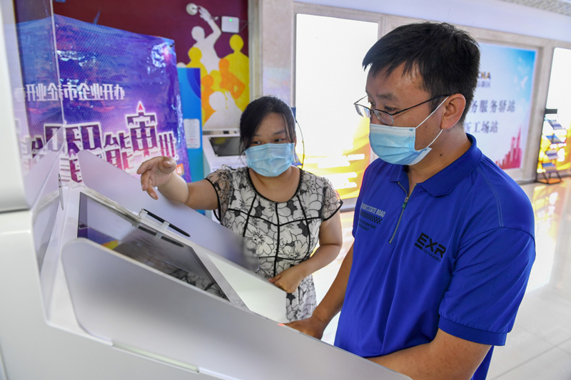2020年6月16日,在吉林省長春新區政務服務驿站擺渡創新工場站,某企業負責人(右)在工作人員的協助下,使用自助服務終端機辦理審批業務。新華社記者 張楠 攝